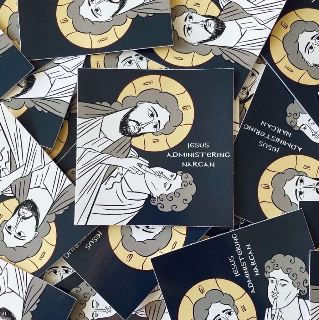 Among Sarchizian’s works are stickers depicting Christ administering Narcan, a medication that reverse the effects of an opioid overdose. Though the medication is a modern invention, the depictions are a way of showing that Christ’s love knows no time or bounds. “Narcan in a way is like a miracle drug. It brings people back from the edge of death,” Sarchizian says. Sarchizian was inspired by the Good Samaritan and Jesus Healing the Blind Man icons, and the works offer a call to love our neighbor as Christ commanded. She suggests the possibility of training programs to equip parishioners or clergy with Narcan; though it may seem daunting, it could do immense good.