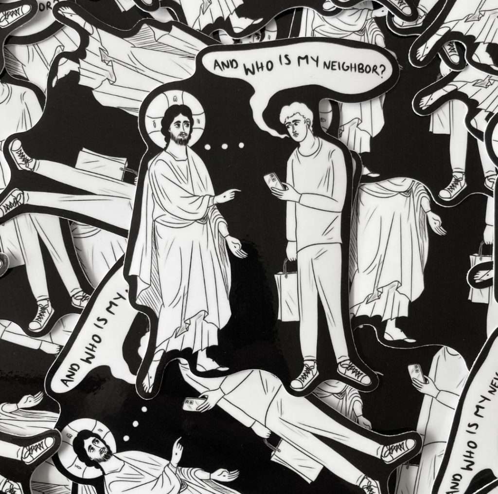 A sticker that resonates strongly with Sarchizian is the “And Who is My Neighbor.” This sticker melded two instances from the parables: the parable of the lawyer (Luke 10:25-37) and the parable of the young ruler (Matthew 19:16-26). Sarchizian gave it a modern twist where the lawyer/rich young ruler has a shopping bag and is not even paying attention to Christ. In Sarchizian’s view, the individual represents us all snarkily asking Christ who our neighbor is, where they are, and why we are so lonely–though Christ is always with us. Christ is depicted as much more tired than the man in the sticker, with His scars visible, a reminder of His ultimate sacrifice for us–he repeatedly has to answer this question of who is there to comfort us, yet he is constantly with us.
