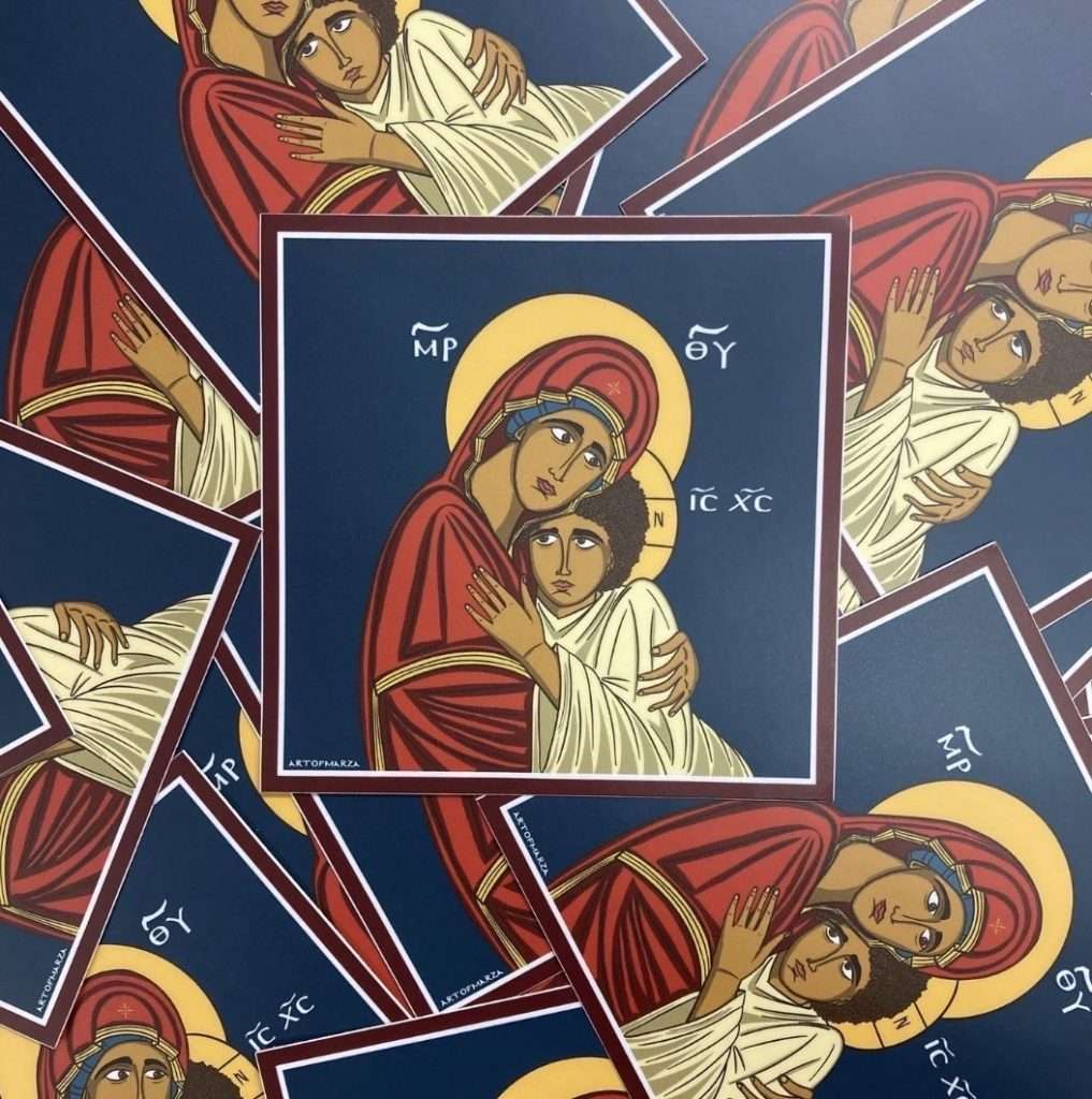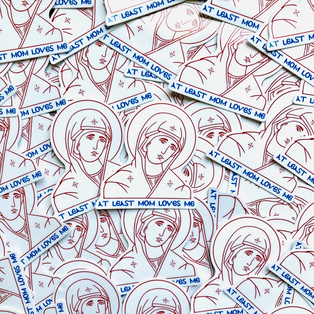 “A lot of people who are lapsed still have respect for the Virgin Mary, so there is power in reaching them with that imagery,” Sarchizian says. Among Sarchizian’s stickers are “Mother’s Comfort,” in which the Theotokos embraces an adolescent Christ; “Protect the Outcast,” embodying the structure of Theotokos tou Ouranion with hands outstretched over Keith Haring-inspired figures; and “At Least Mom Loves Me,” which reminds us of the Theotokos’s holy, unconditional maternal love. Sarchizian emphasizes she is not an iconographer, but her work speaks to the public and connects with Orthodox Christians and non-Christians alike in a way that icons do. Sarchizian herself finds immense comfort in the Theotokos when she feels like an outcast in the Church, which is why much of her work is centered on the Theotokos.