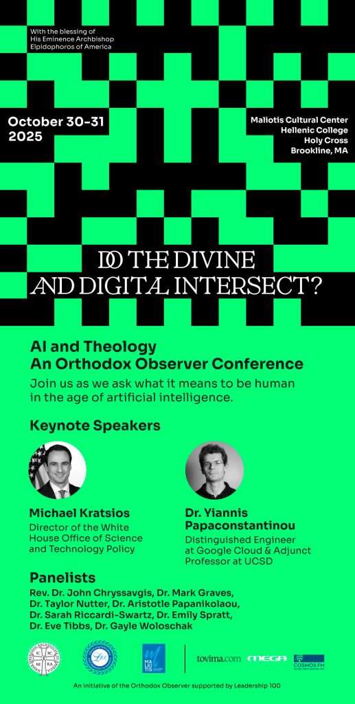 Do the divine and digital intersect? Join us for an AI & Theology Conference exploring technology, ethics, and spirituality—and what it means to be human in the age of artificial intelligence. An initiative of the Orthodox Observer with the blessing of His Eminence Archbishop Elpidophoros of America, this conference is supported by Leadership 100 and hosted by the Maliotis Cultural Center.