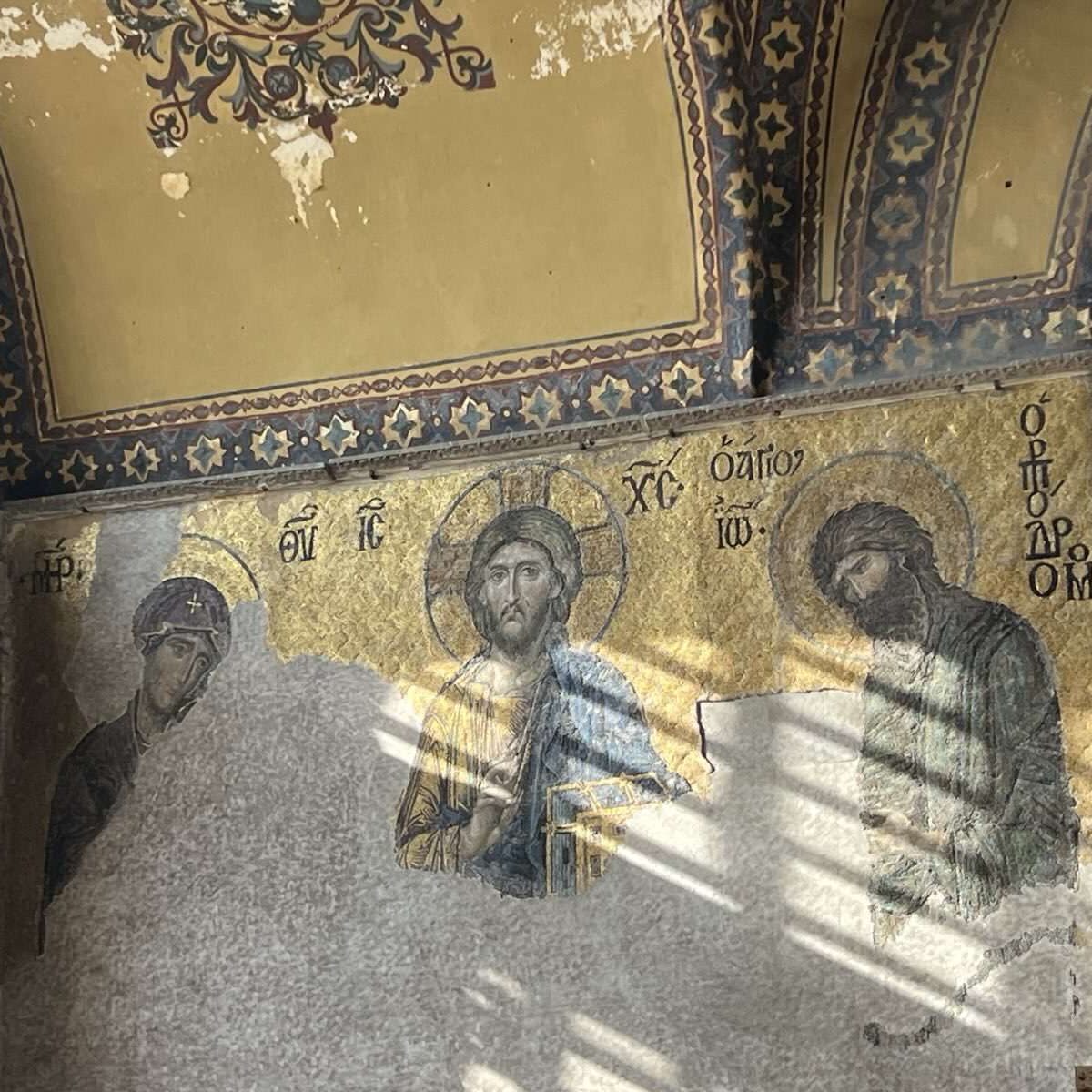 He paused beside the few surviving mosaic icons that remain visible including a mosaic of the Virgin Mary, Christ Pantocrator, and St. John the Baptist, tucked high on an upper gallery, spared from the plaster that conceals most others.