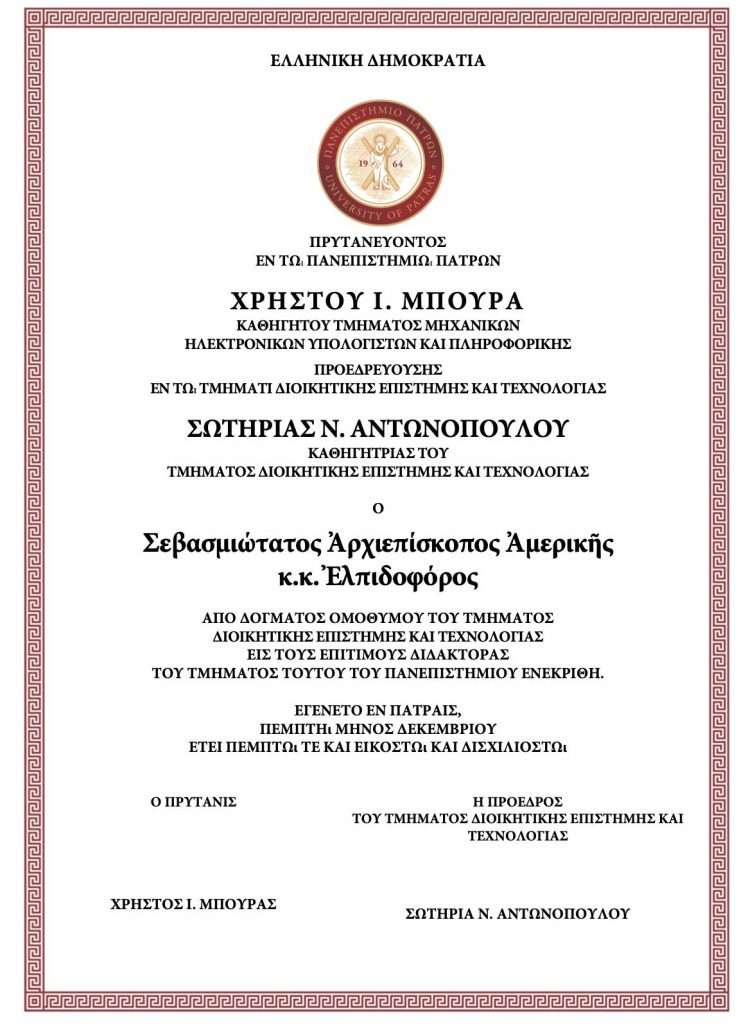 The post University of Patras confers honorary doctorate on Abp. Elpidophoros appeared first on Orthodox Observer.