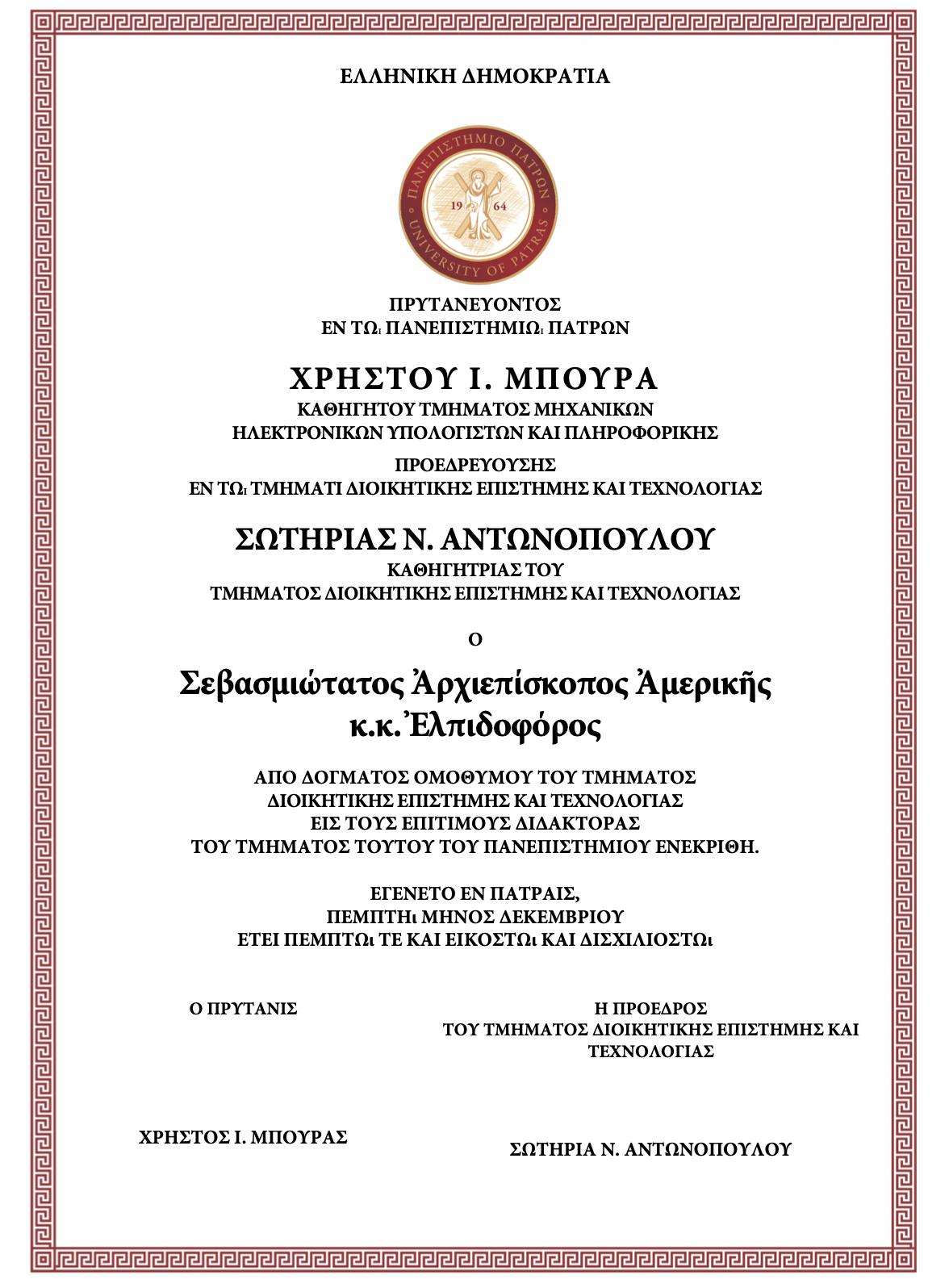 “In the course of his life, His Eminence has demonstrated, with scholarly consistency, that management science and pastoral practice can fruitfully coexist when the research approach meets ecclesial experience. His sound judgment, his well-documented methodological approach, and the consistency that characterizes him as a hierarch reflect a deep understanding of both the institutional and the theological framework. The proposal of the Department of Management Science and Technology to honor him, which the Senate of the University of Patras unanimously accepted, highlights precisely this creative meeting of administrative thought with ecclesiastical tradition.”
