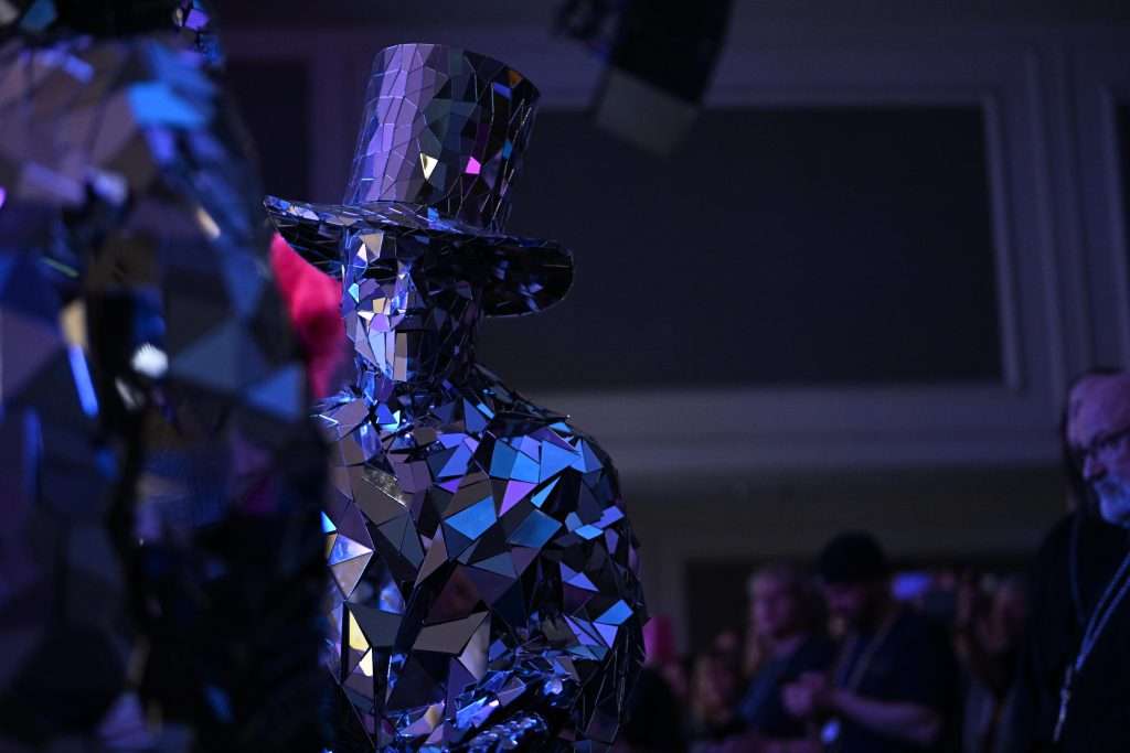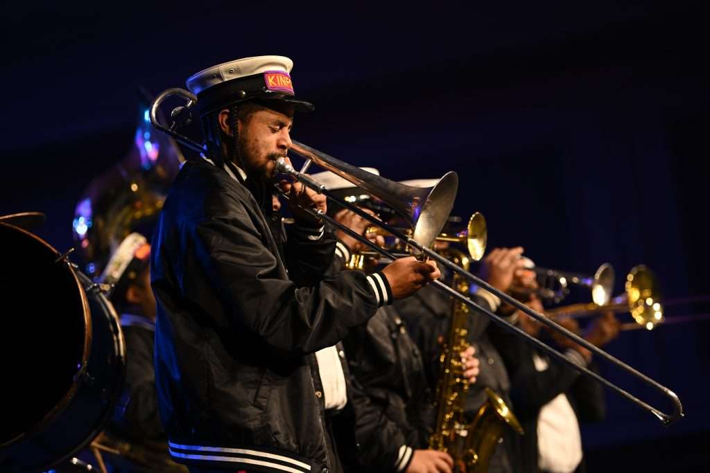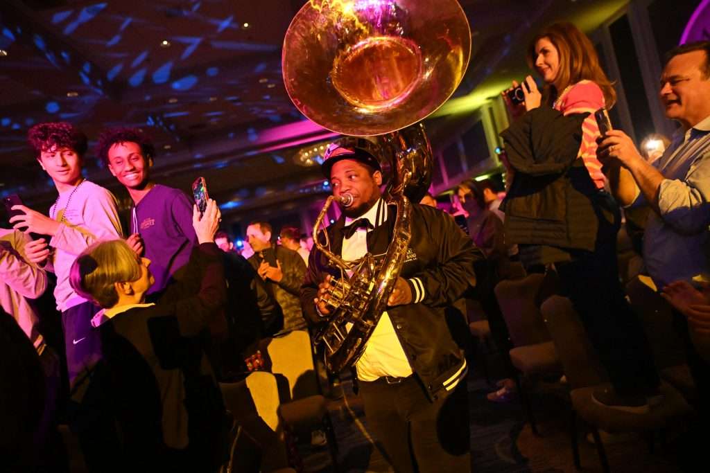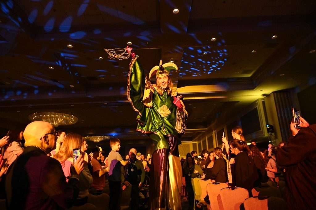Following a drumline, one of New Orleans’s top brass ensembles, Kinfolk, paraded through the grand ballroom. Moko jumbies, or stilt walkers, tossed colorful Mardi Gras bead necklaces to teams who have come from 17 U.S. states and around the world to showcase the beauty of traditional Greek folk dancing and music.