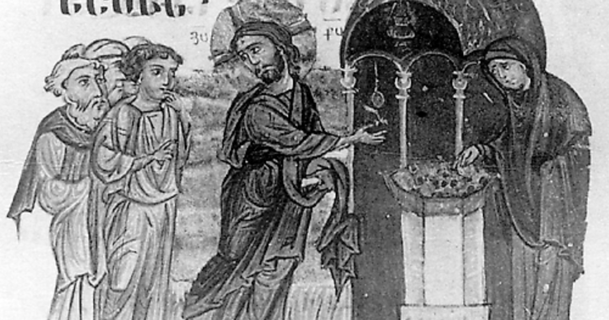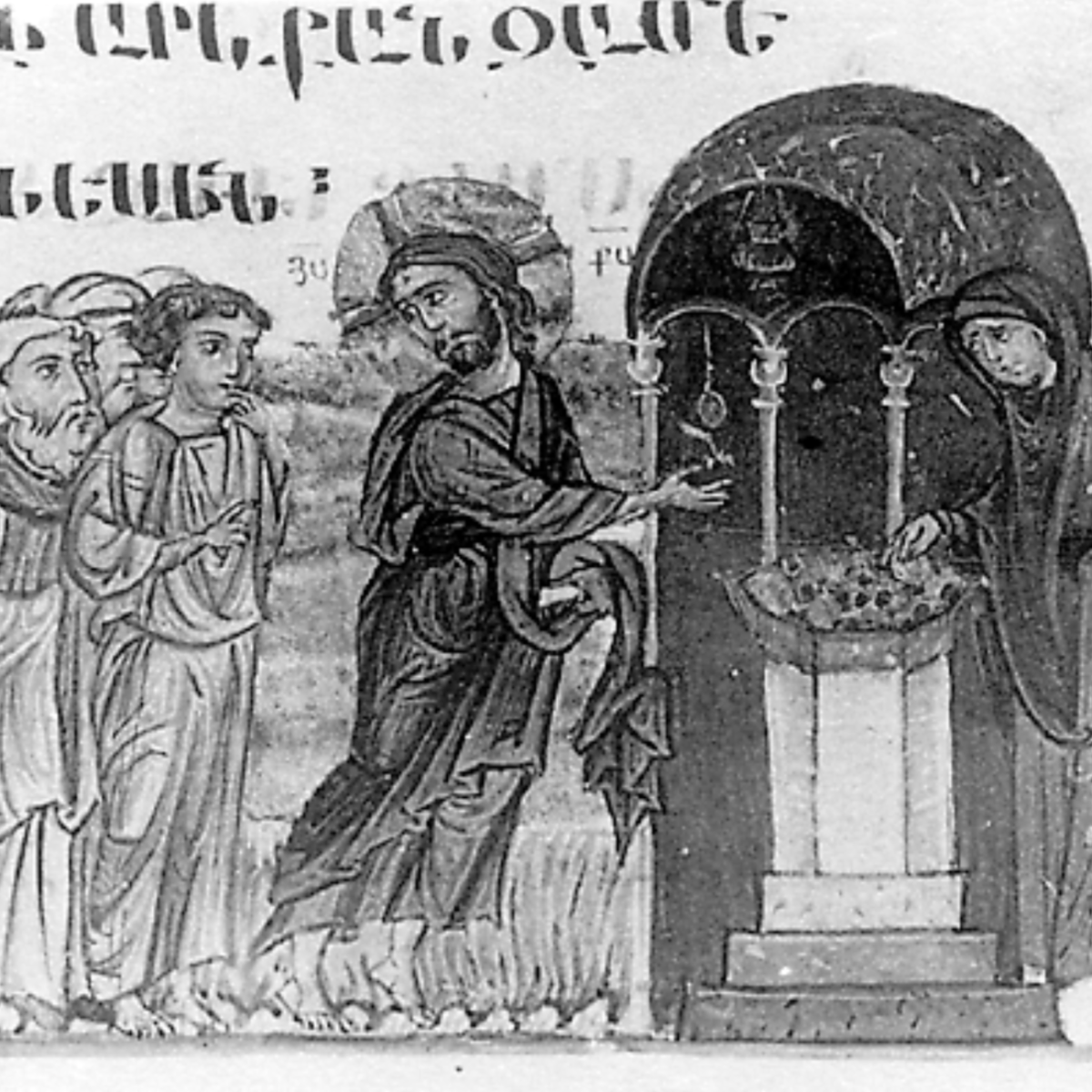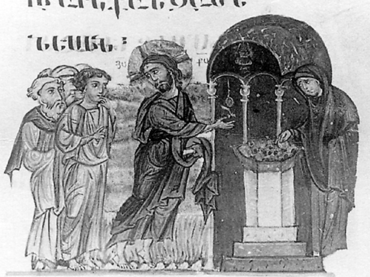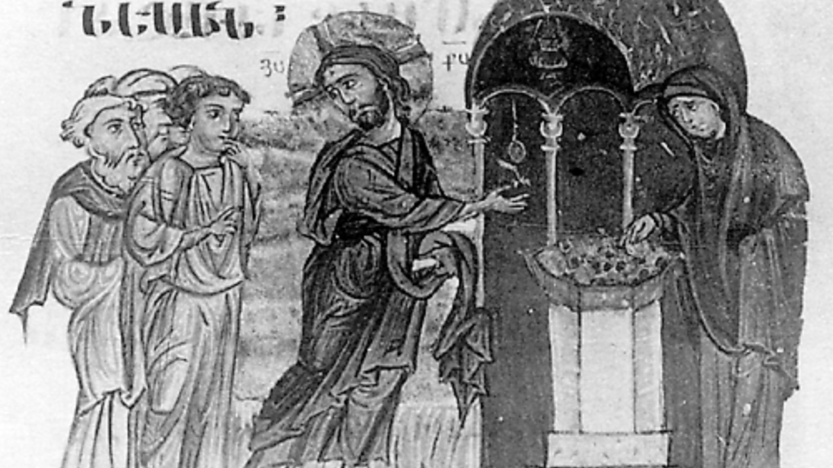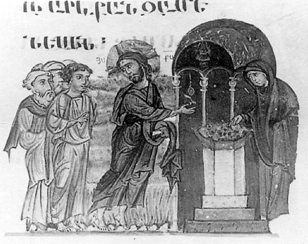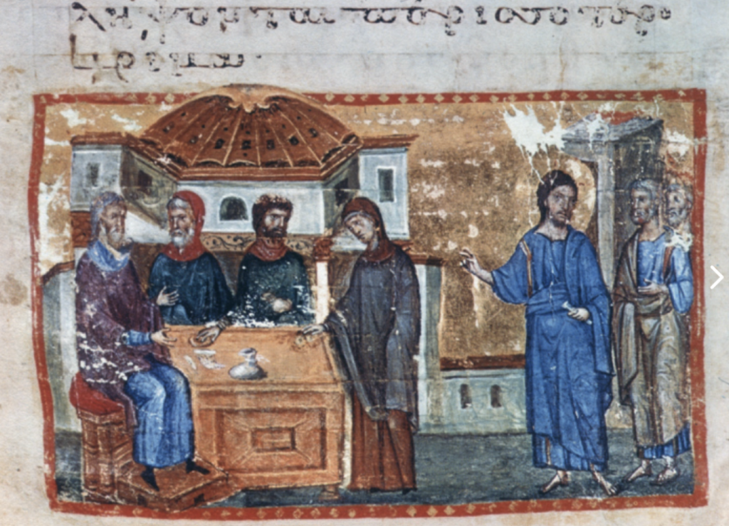 “The Widow’s Mite” in a Byzantine Gospel illumination, 1200-1299, held at Iviron Monastery on Mount Athos.