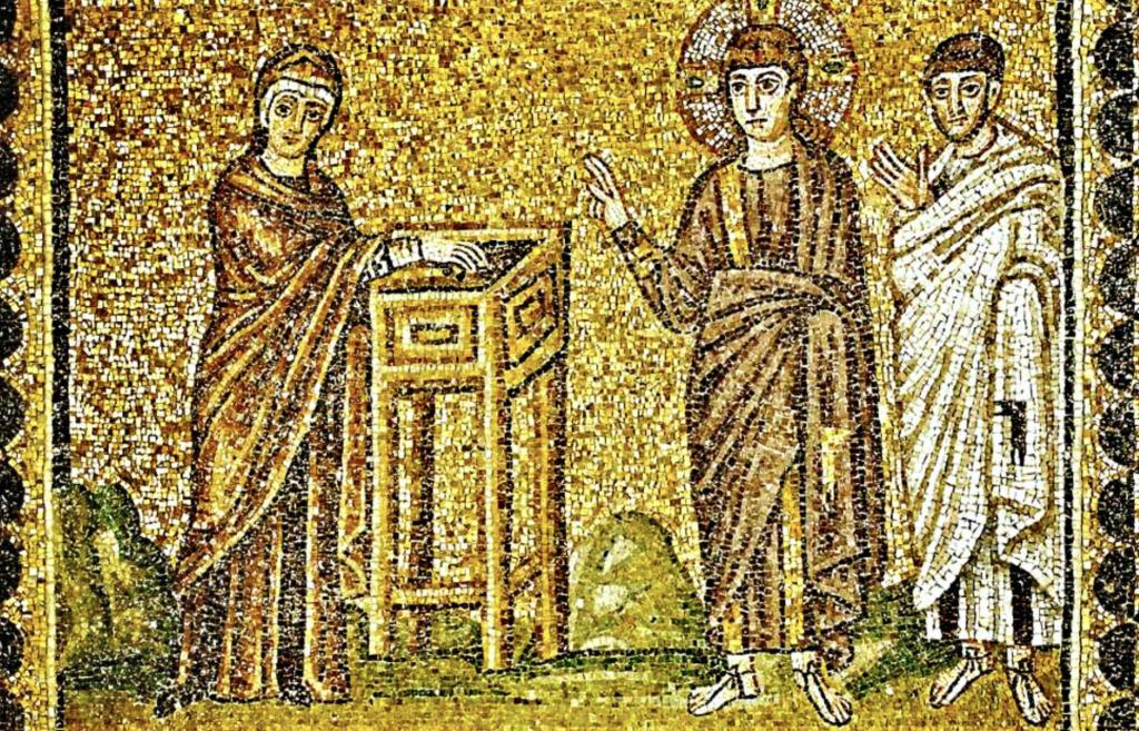 Mosaic in the Basilica of Sant’Apollinare Nuovo, in Ravenna, north Italy, 500-520 CE. One of the earliest extant depictions of “The Widow’s Mite.”