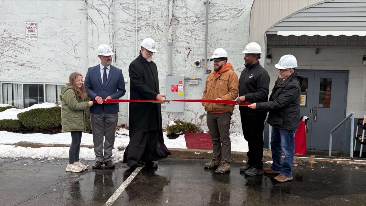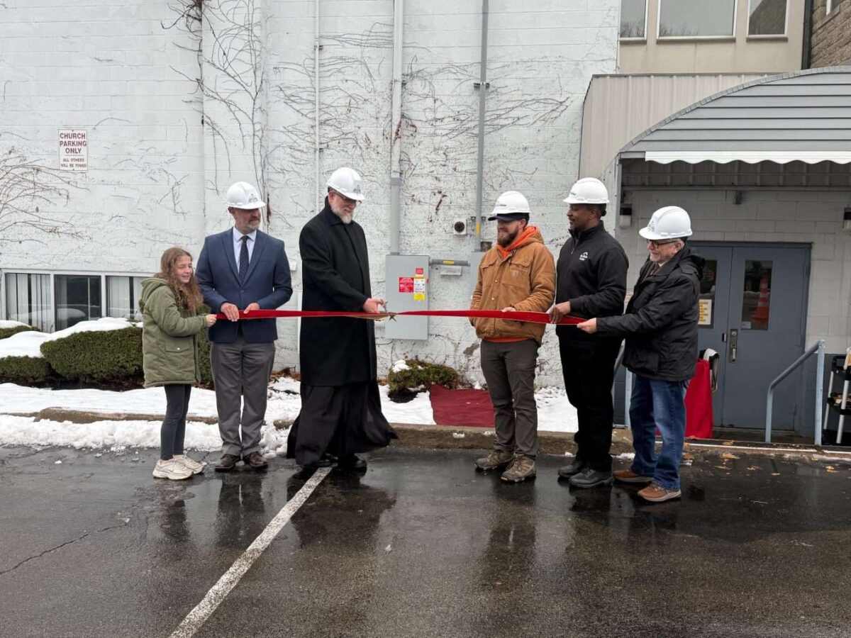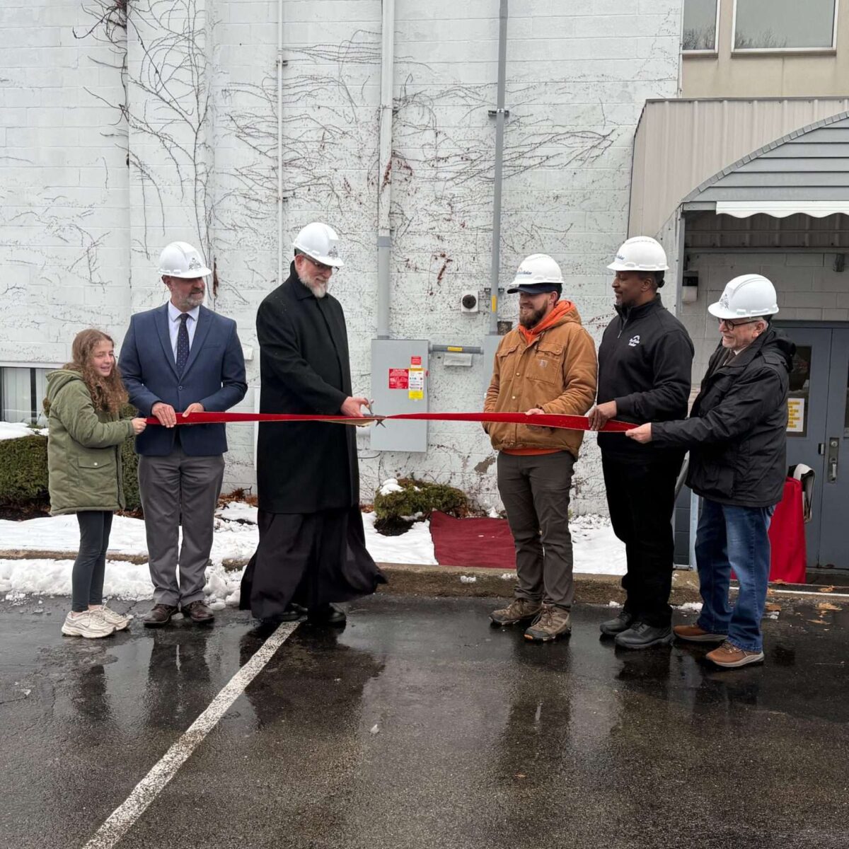 Ribbon cutting on powering up event; pictured from left to right: Helena Akios, Fr. Paul Patitsas, Board Members Chris Akios and President Peter Hiczewski, Buffalo Solar representatives Michael Watts and Matt McCoy. Photo by Alyssa Sengbusch