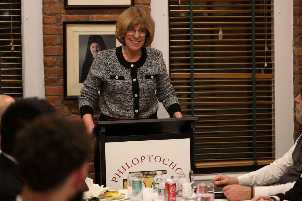 The program featured an engaging presentation and dialogue led by National Philoptochos Secretary Philippa Condakes, National Philoptochos Treasurer Anna Vedouras, and Marketing and Communications Associate Katherine Clark. Although unable to attend in person, Department of Social Services Director Paulette Geanacopoulos and Administrative Assistant Elizabeth Douglass played an integral role in shaping the evening’s program. In Paulette’s stead, Anna Vedouras offered a thoughtful introduction to the Department of Social Services, highlighting the breadth of Philoptochos’ philanthropic outreach and its enduring presence in parish communities across the country.