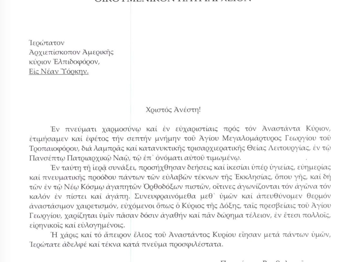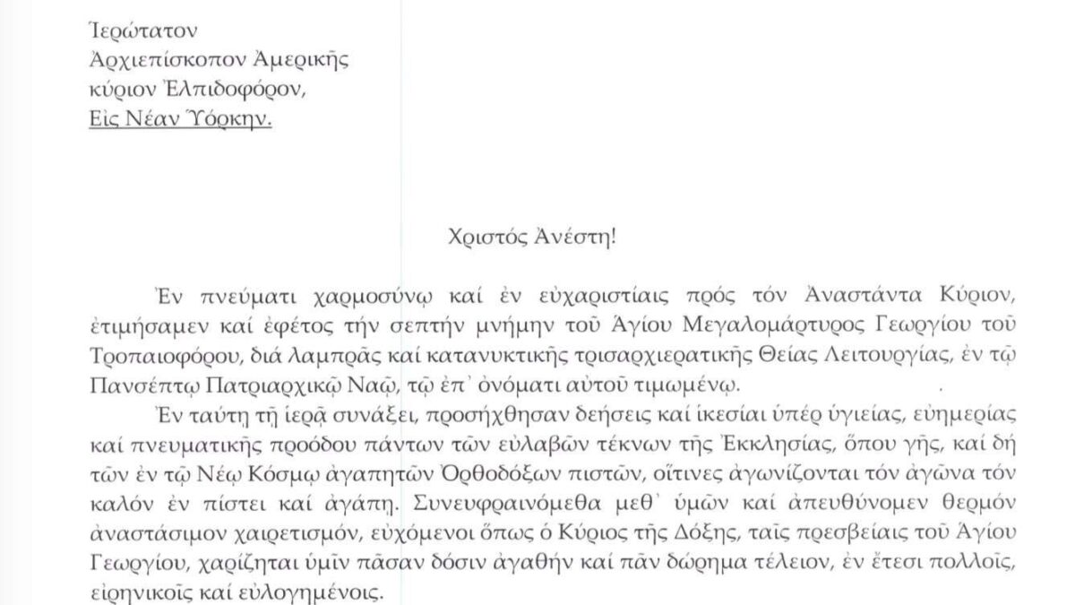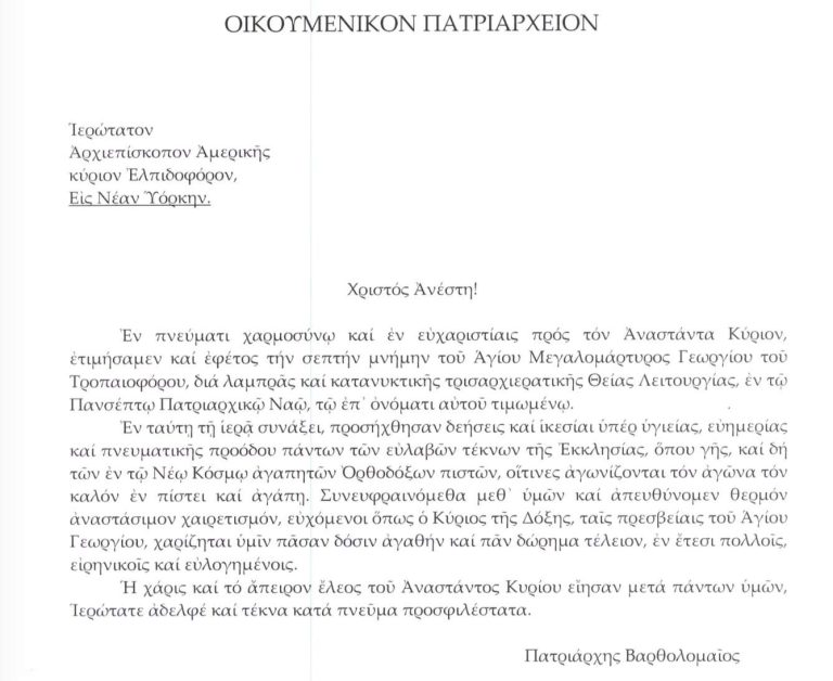 NEW YORK – On the occasion of the feast of the Holy Great Martyr George the Trophy-Bearer, His All-Holiness Ecumenical Patriarch Bartholomew sent a letter to His Eminence Archbishop Elpidophoros of America, conveying Paschal greetings and paternal blessings to him and the faithful of the Greek Orthodox Archdiocese of America.